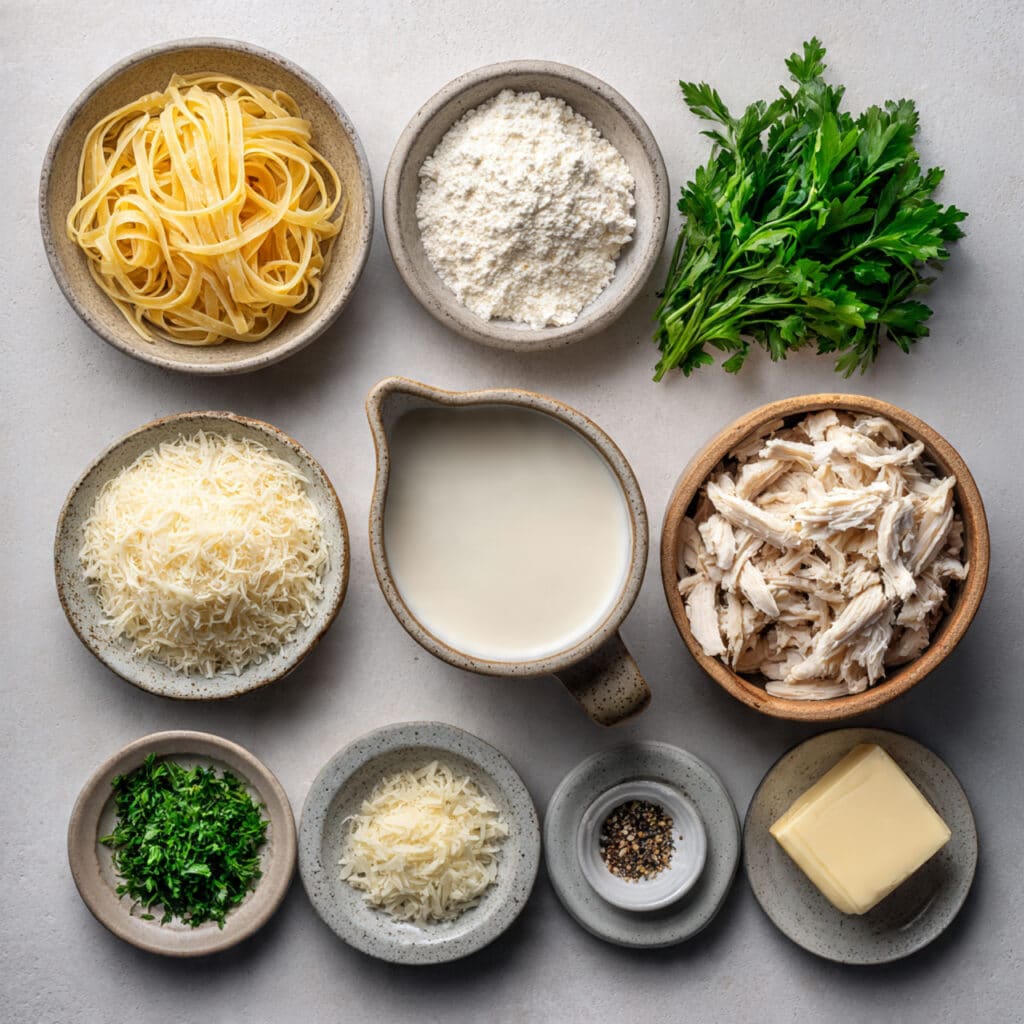A quick and comforting creamy chicken pasta bowl made with tender pasta, juicy shredded chicken, and a rich parmesan cream sauce ready in just five minutes.