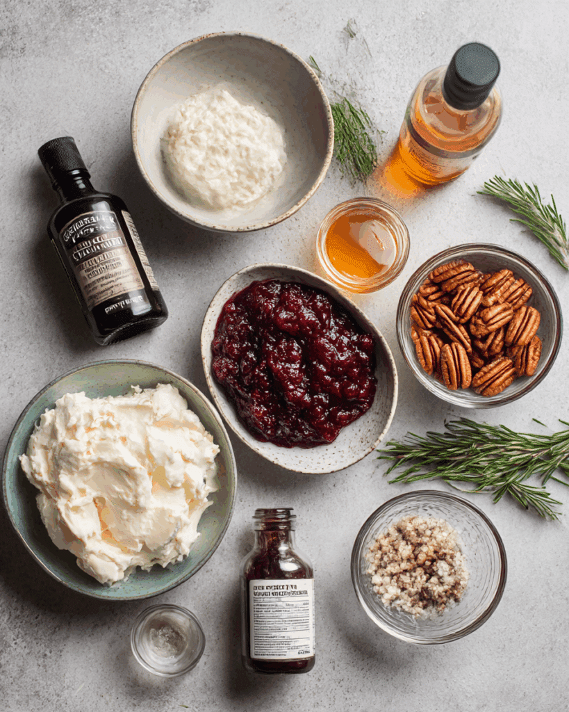 Cranberry Sauce: This tangy, ruby-red sauce doesn’t just bring color. It adds sweet-tart depth that cuts through the richness of the cheese and pairs beautifully with the herbs and nuts.