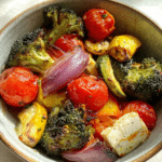 A colorful, comforting bowl of roasted vegetables and creamy baked feta, this dish is packed with Mediterranean flavor and easy weeknight charm.