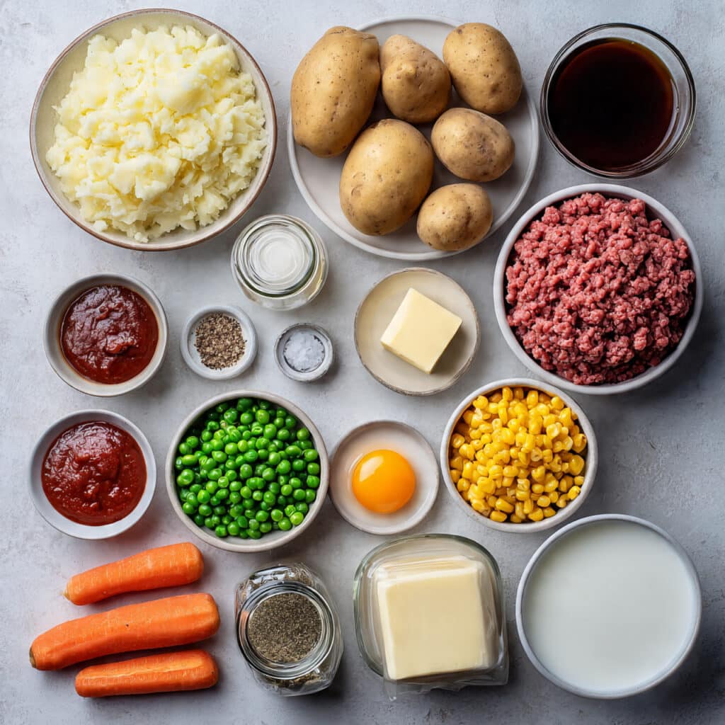 In a large skillet over medium heat, cook the ground beef until browned. Drain excess fat. Add onions, garlic, carrots, and cook for about 5 minutes until softened. Stir in tomato paste, then pour in beef broth and Worcestershire sauce. Add peas and corn. Simmer until slightly thickened, about 5–7 minutes. Season with salt and pepper. - Prepare Your Cooking Vessel:
