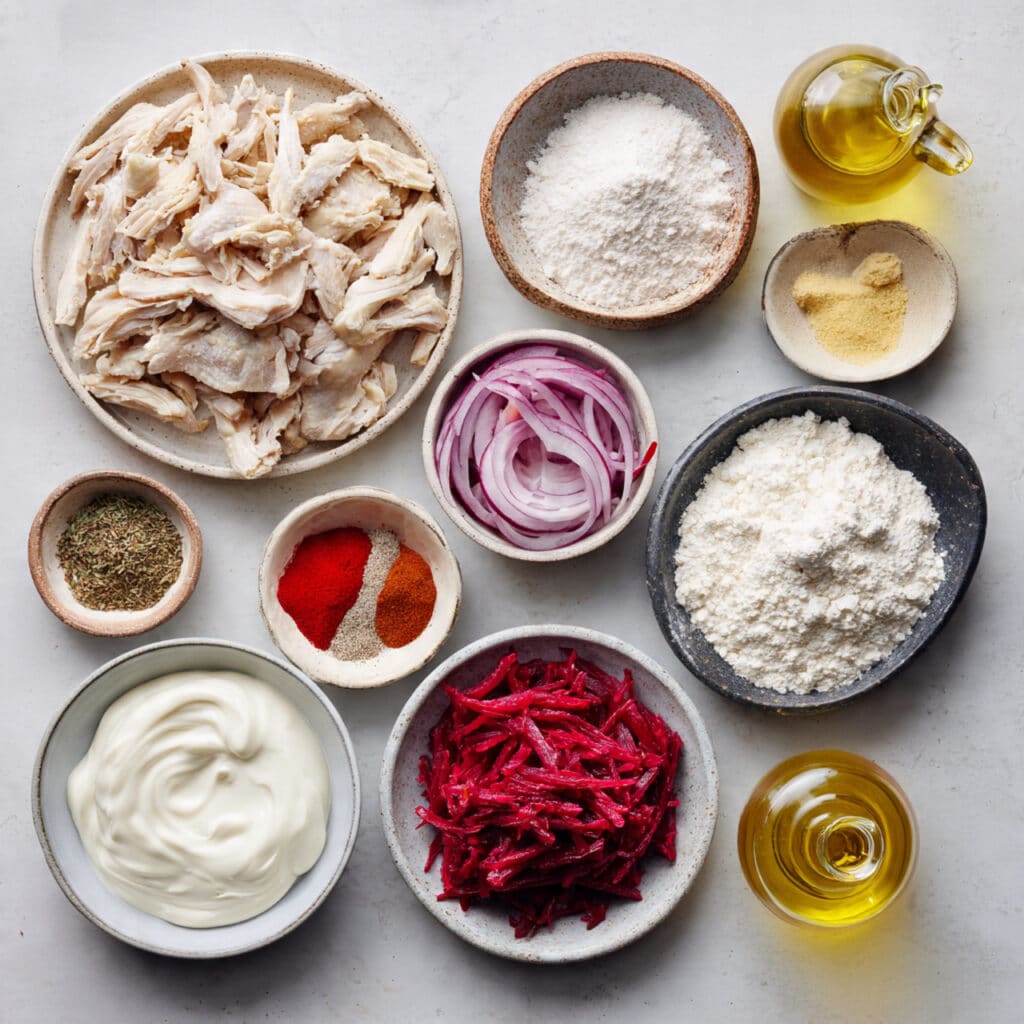- Combine Ingredients: In a bowl, mix shredded chicken with cumin, paprika, salt, and pepper. Toss in sliced onions and peppers. In another bowl, mix flour, beetroot puree, olive oil, and salt to make the wrap dough.