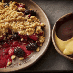 Crumble desserts originated in Britain during World War II, when pie ingredients were rationed, and home bakers found clever ways to make do. The simple mix of butter, flour, and sugar became the iconic “crumble,” now a classic comfort dish around the world. This modern twist — pairing tart berries with velvety chocolate and custard — honors the original’s spirit of resourceful creativity while bringing it firmly into the realm of irresistible decadence.