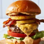 This burger thrives on contrast—crispy bacon, creamy sauce, melty cheese, juicy patty, and sweet fried plantain all packed between a soft, toasted bun. The result is rich, messy, and absolutely crave-worthy.