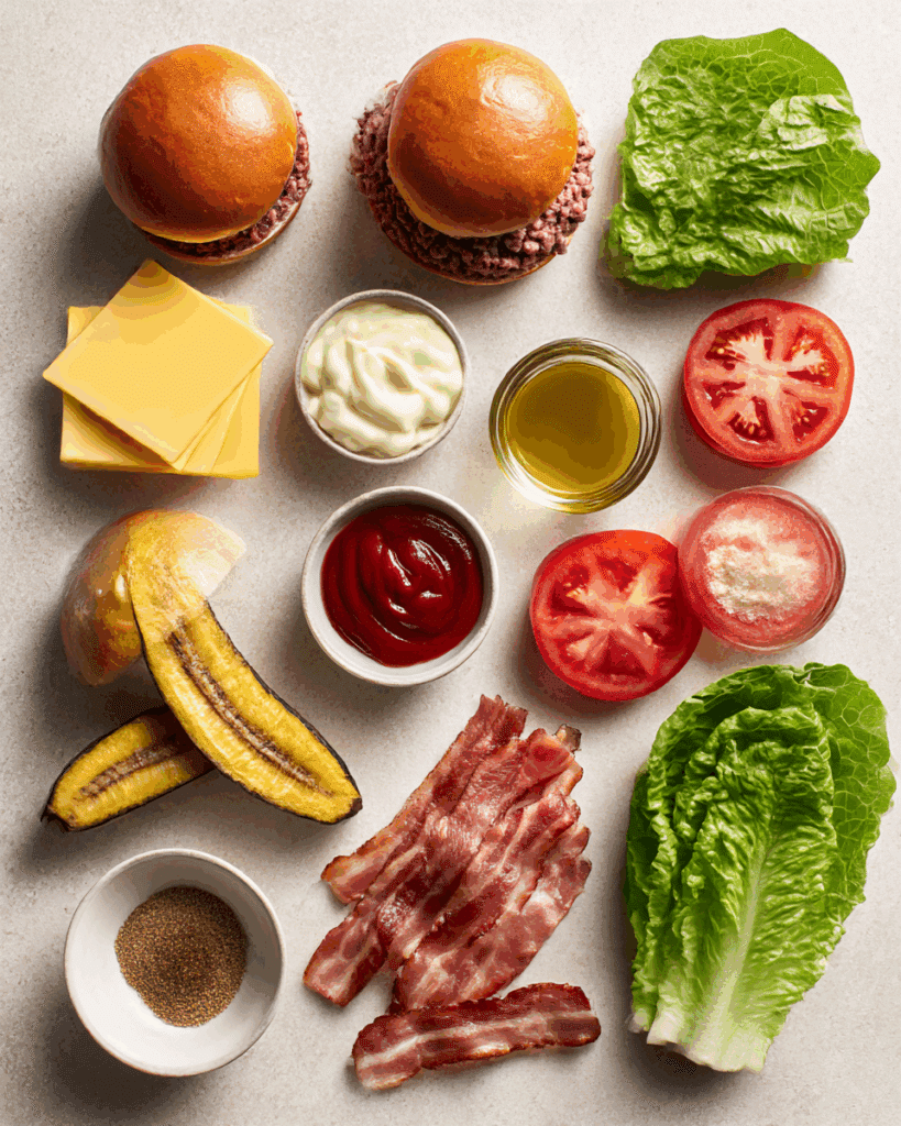 - Assemble burgers: layer lettuce, tomato, patty with melted cheese, bacon, fried plantain, and sauce between toasted buns.