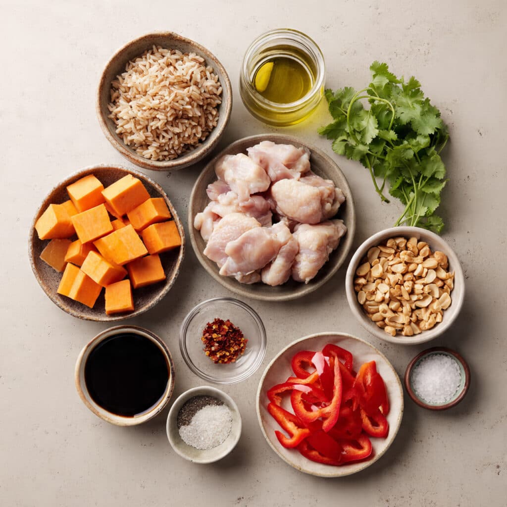 A wholesome and hearty brown rice chicken bowl loaded with roasted sweet potatoes, red bell peppers, tender shredded chicken, and topped with crushed peanuts and fresh cilantro. This balanced, flavorful bowl is perfect for meal prep or a quick comforting dinner.