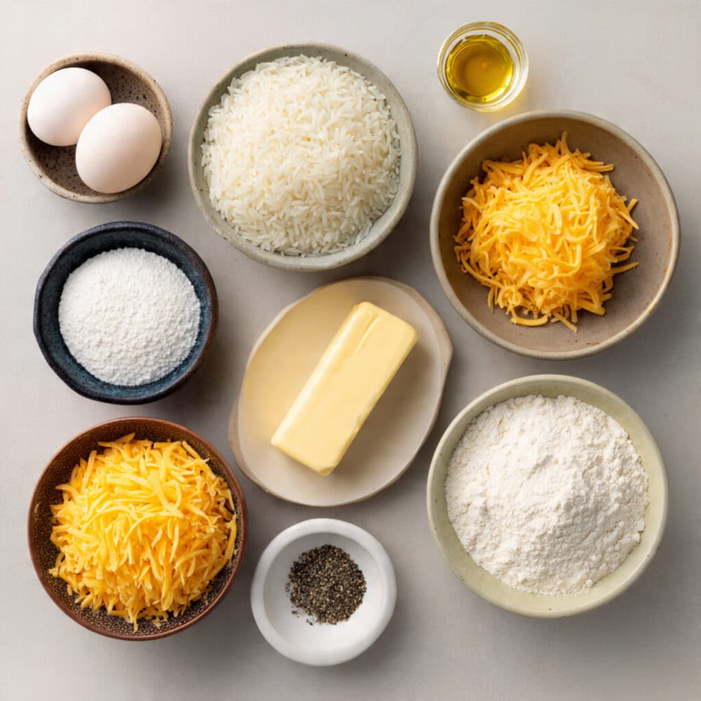 - Combine Ingredients: In a large mixing bowl, stir together the cooked rice, shredded cheddar cheese, eggs, flour, salt, and black pepper until evenly combined.