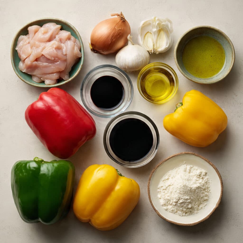 When you look at these ingredients side by side, you can already imagine the harmony of textures and flavors. The sweetness of bell peppers, the savoriness of chicken, and that glossy sauce that ties it all together.