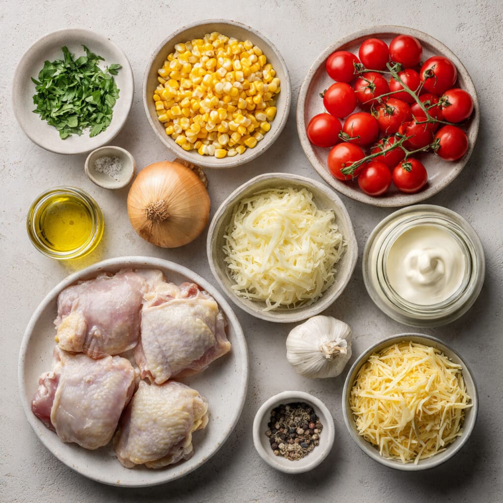This Chicken & Corn Skillet Bake is the perfect weeknight comfort food, featuring tender chicken thighs, sweet corn, cherry tomatoes, and melty cheddar cheese in a creamy sauce baked to golden perfection.