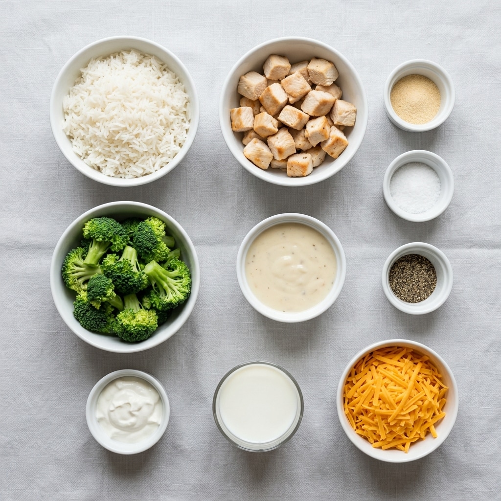 A comforting casserole layered with fluffy rice, tender chicken, broccoli, and a creamy sauce topped with melted cheddar cheese, baked until golden and bubbly.