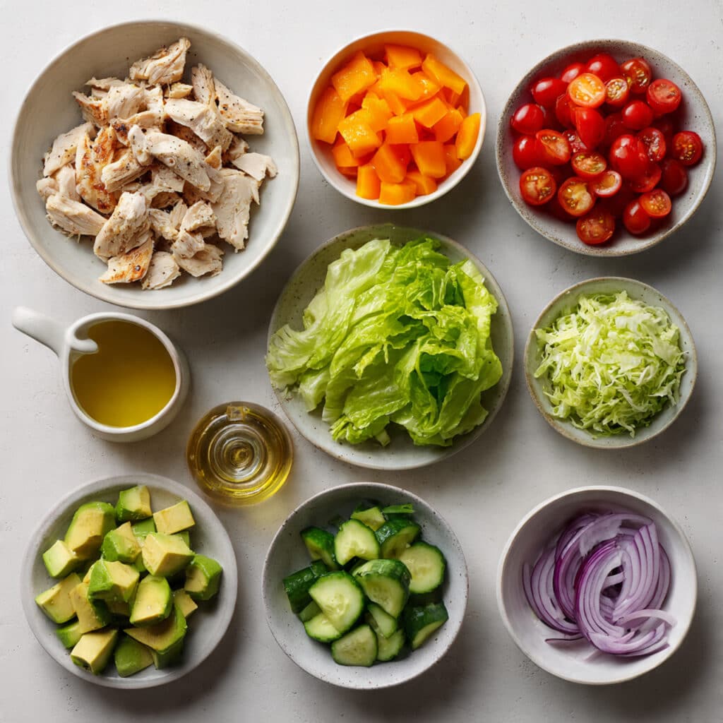 - Assemble the Dish: In a large serving bowl, lay down a bed of lettuce. Layer on the chicken, tomatoes, bell pepper, cucumber, avocado, and onion.
