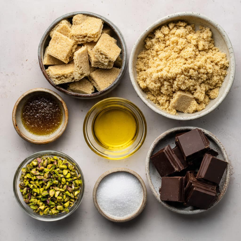 The beauty of these bars lies in the contrast. The base is crisp and lightly sweet, giving you that firm bite. On top, a thick layer of smooth melted chocolate sets into a glossy finish that almost shines. Then come the pistachios, adding a nutty depth and gentle crunch in every mouthful.