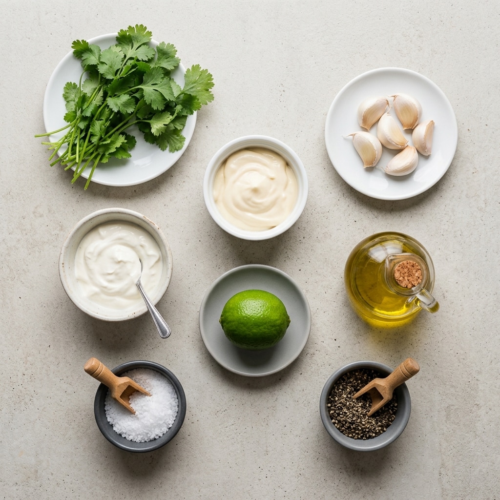 - Combine Ingredients: Add cilantro, sour cream, mayonnaise, fresh lime juice, garlic, olive oil, salt, and black pepper to the blender.