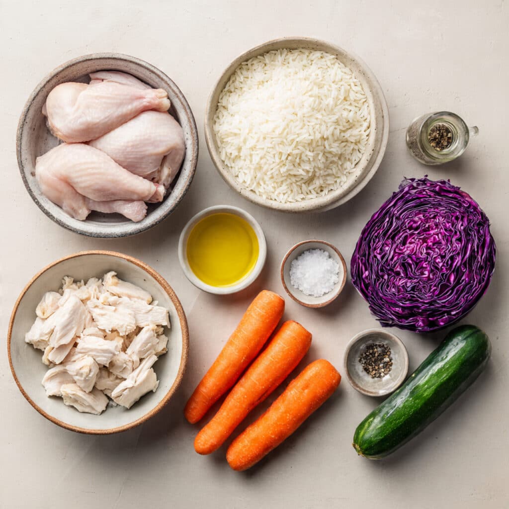 The beauty of this dish is not just visual. Each layer brings something important. The rice is soft and comforting. The chicken is savory and warm. The carrots add gentle sweetness. The cucumbers bring crisp freshness. The cabbage adds crunch and a pop of color.