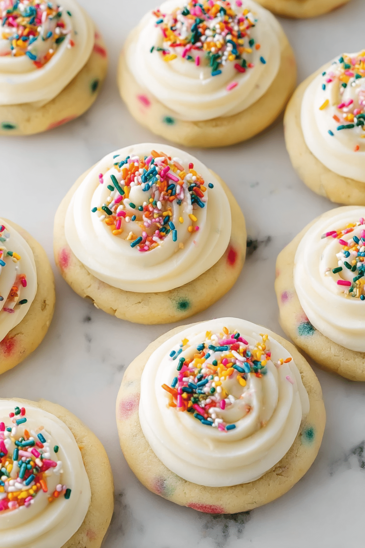 Pipe the frosting in a tall spiral and top with metallic or themed sprinkles. Stack them on a tiered stand with candles for a cookie “birthday cake.” A sprinkle of edible glitter or shimmer dust can also add that extra wow factor.