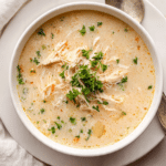 A rich and comforting creamy roasted garlic chicken soup made with tender shredded chicken, mellow roasted garlic, and a silky cream based broth that is perfect for cozy meals.