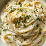 The pasta is tender yet firm, coated in a velvety white sauce that feels rich without being heavy. The garlic adds gentle warmth, the cheese melts into the sauce for extra creaminess, and the black pepper gives a subtle kick. This one’s a total game-changer for comfort food lovers.