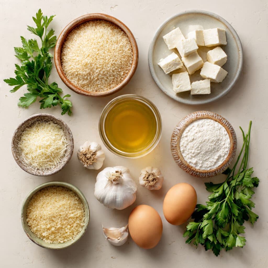 - Arborio Rice: 1.5 cups of short-grain rice which provides the necessary starch and sticky texture for shaping.