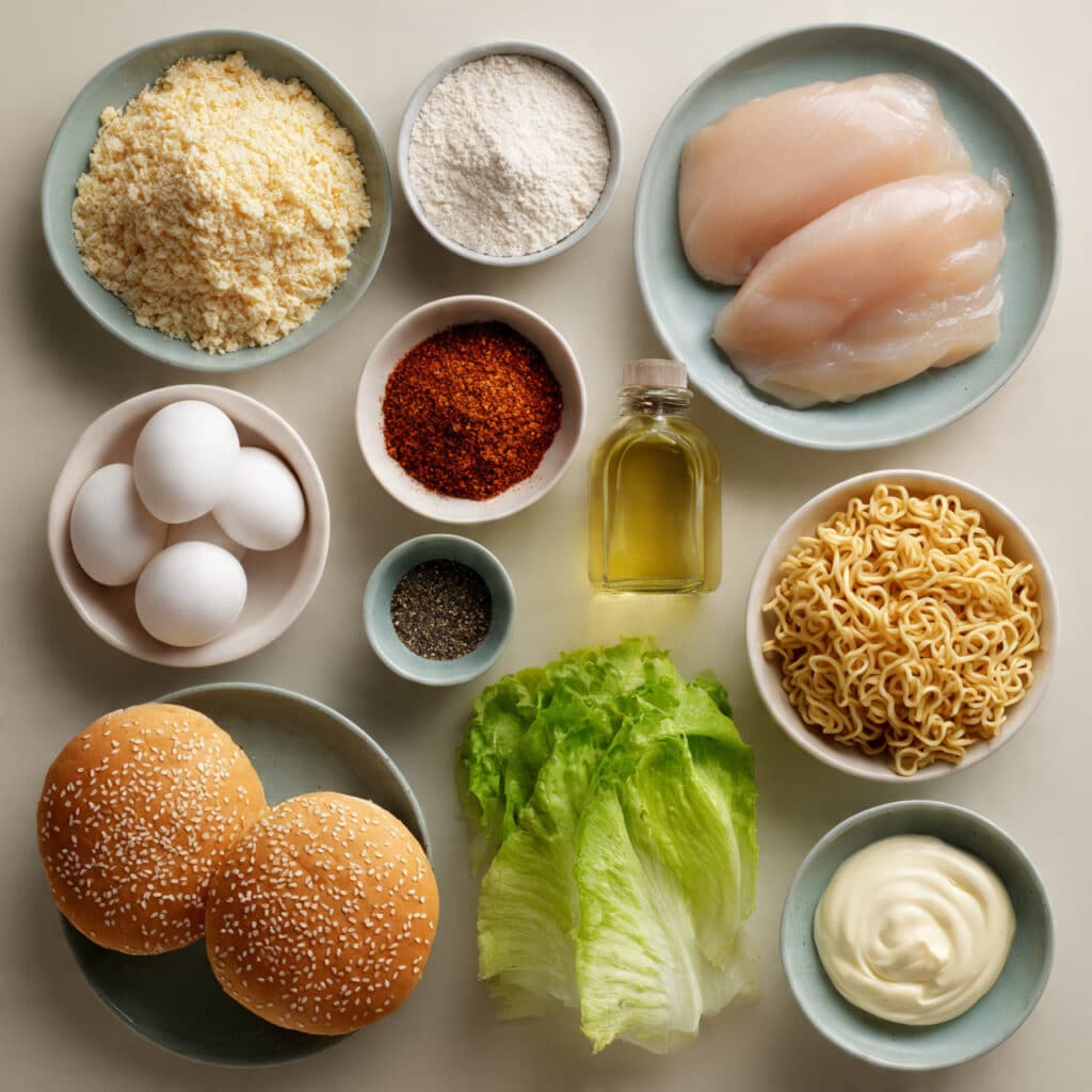 Instant Fried Noodles: These bring unexpected crisp texture and make this sandwich stand out from ordinary chicken buns.