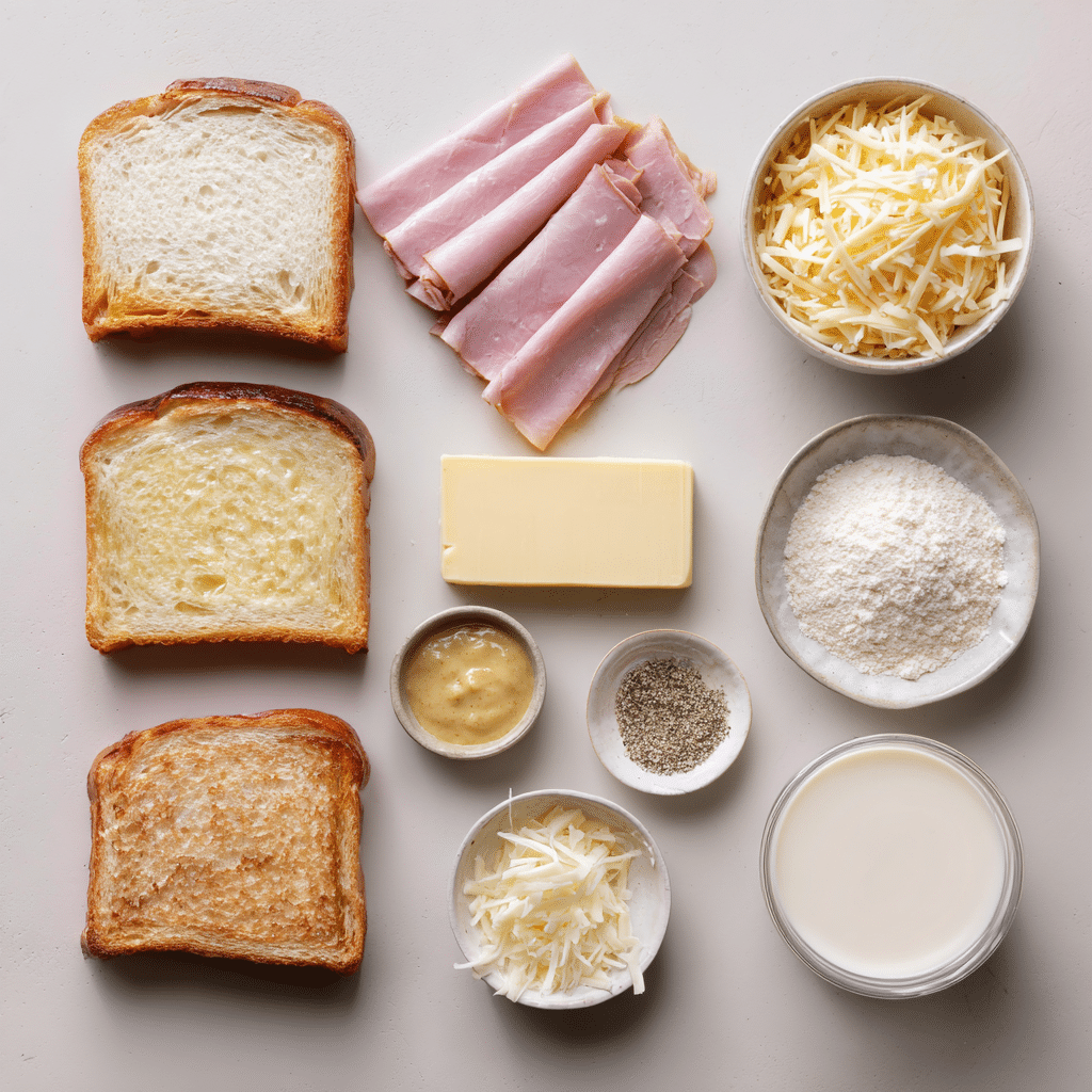 - Assemble the Dish: Spread Dijon on inside of bread. Add ham, sprinkle cheese, and a spoonful of béchamel. Top with second bread slice, buttered side up.