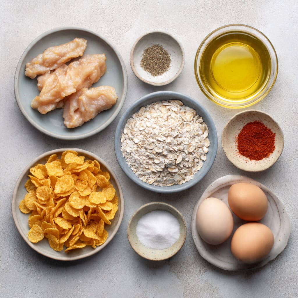 - Assemble the Dish: Dredge each chicken tender in flour, dip into egg, then press firmly into crushed cornflakes to coat evenly.
