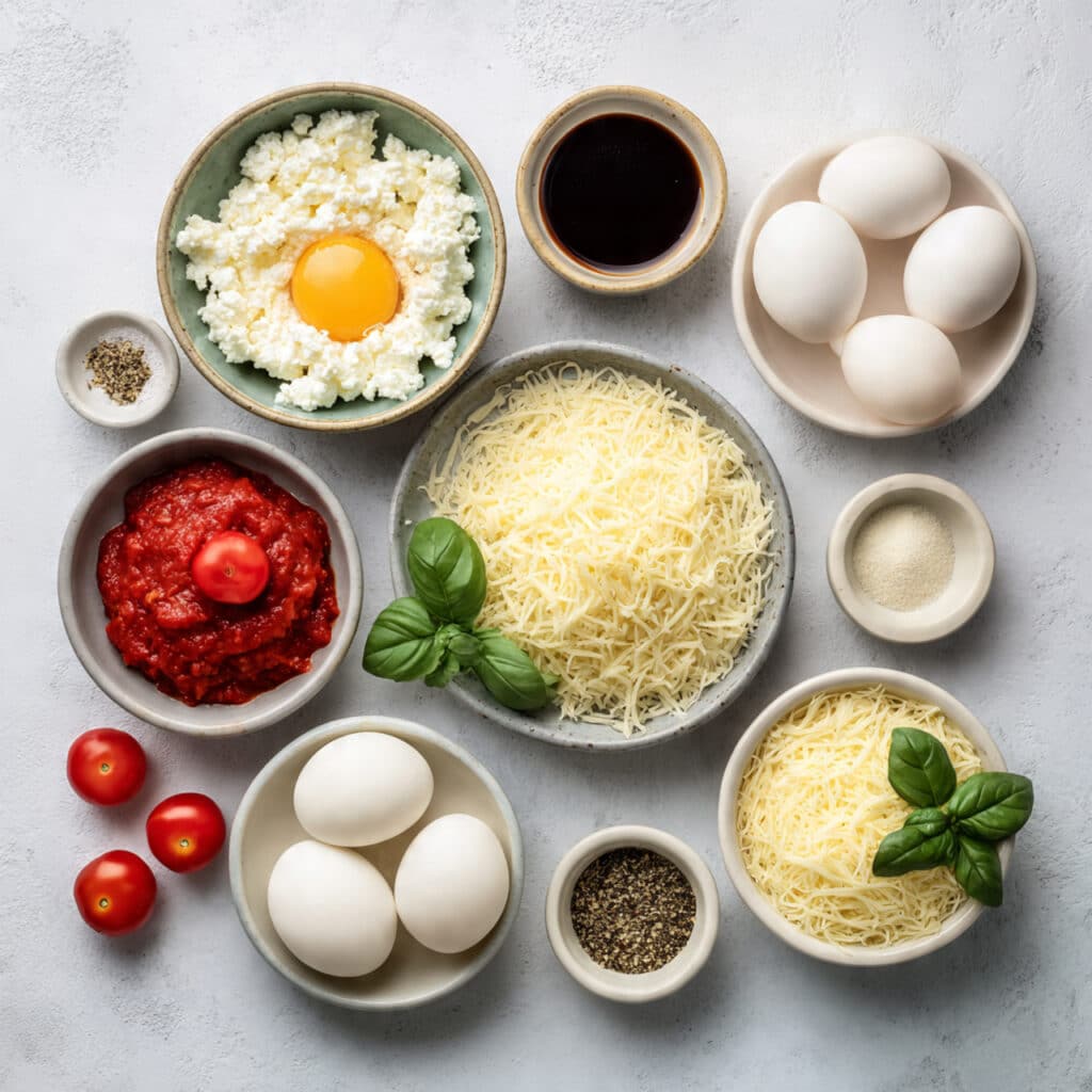 The base is soft yet structured, almost like a fluffy egg bake with a lightly crisp edge. The melted mozzarella creates a stretchy layer over the tangy tomato sauce. Fresh basil adds brightness that balances the richness. Each bite feels satisfying without being overly heavy.