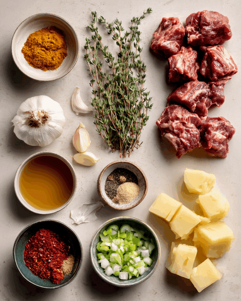 The meat becomes tender and fall-off-the-bone, wrapped in a deeply spiced sauce. Potatoes absorb all that goodness, while the curry is rich, thick, and vibrant. Scotch bonnet offers heat that lingers, not overwhelms, and the thyme cuts through with freshness.