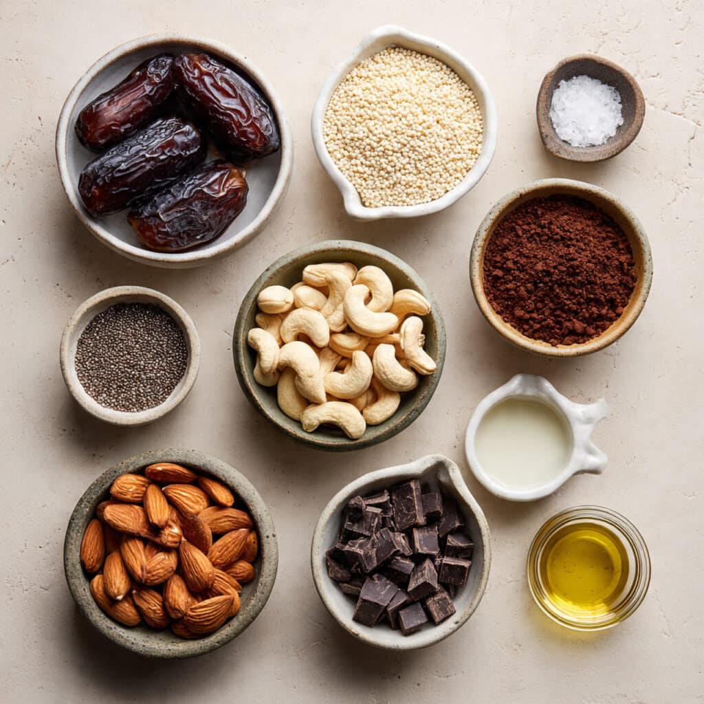 In a food processor, blend dates until a sticky paste forms. Add almonds, cashews, chia seeds, cocoa powder, and a pinch of salt. Pulse until combined but still chunky. Transfer to a bowl and fold in puffed quinoa.