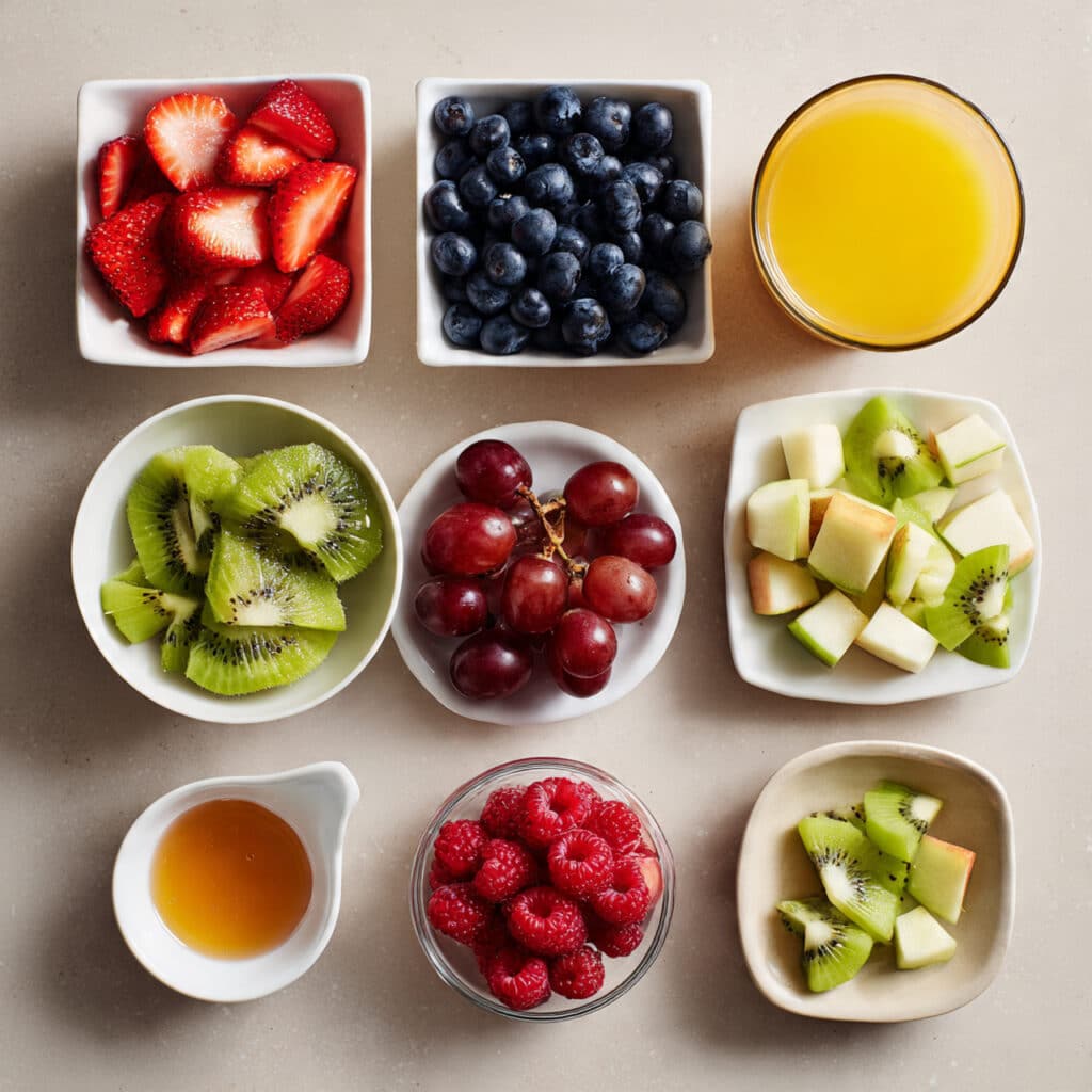 A refreshing, vibrant bowl of fresh fruit salad made with strawberries, blueberries, kiwi, grapes, raspberries, and apples, lightly tossed with citrus juice and optional honey. Perfect for a healthy snack or a colorful side dish.