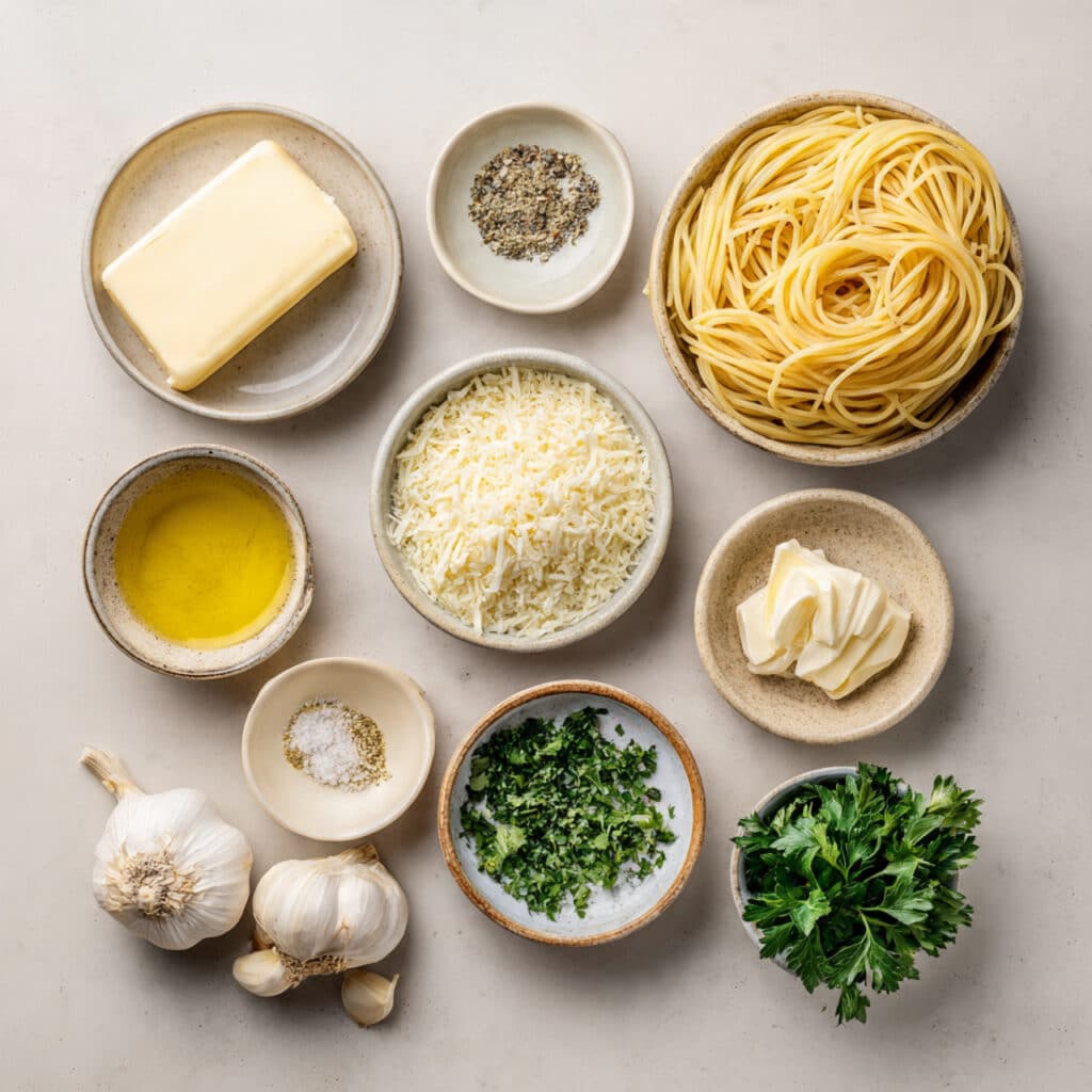 A simple and comforting pasta dish made with buttery garlic sauce, finished with grated cheese and fresh herbs. Quick to prepare, rich in flavor, and perfect for busy days or cozy dinners.