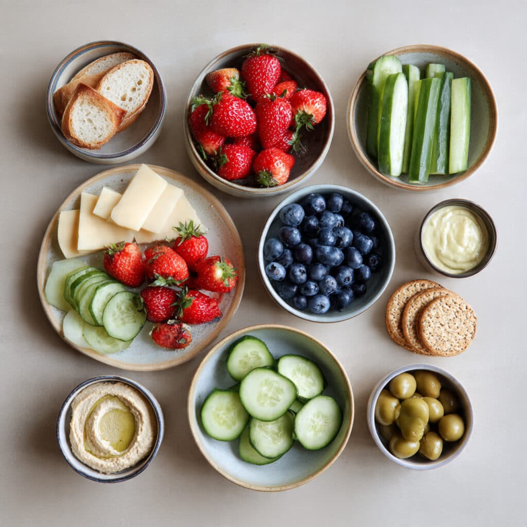 - Combine Ingredients: Arrange cheese, strawberries, blueberries, cucumber slices, olives, hummus, baguette slices, and crackers within reach.