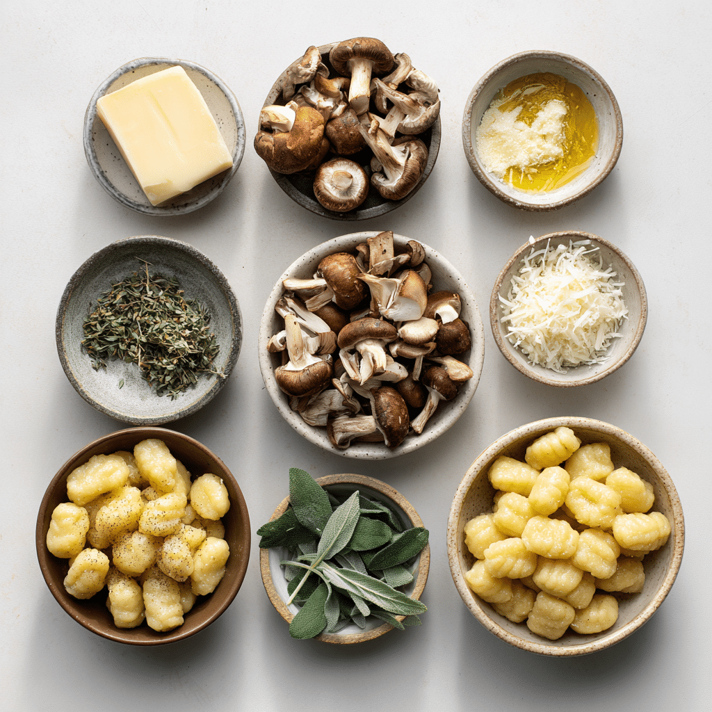 Ingredients in Gnocchi and Mushrooms in a Brown Butter Sauce
