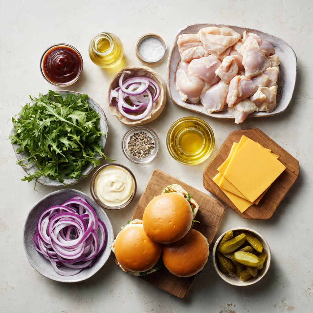 - Boneless Skinless Chicken Thighs or Breasts: 4 pieces, pounded evenly – These are the juicy, protein-packed base for the sandwich.