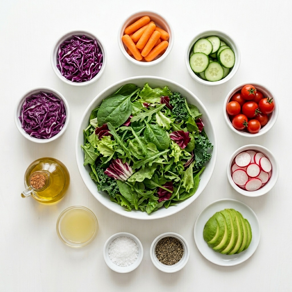 - Assemble the Dish: Layer cabbage, carrots, cucumber, tomatoes, radish, and avocado over the greens.