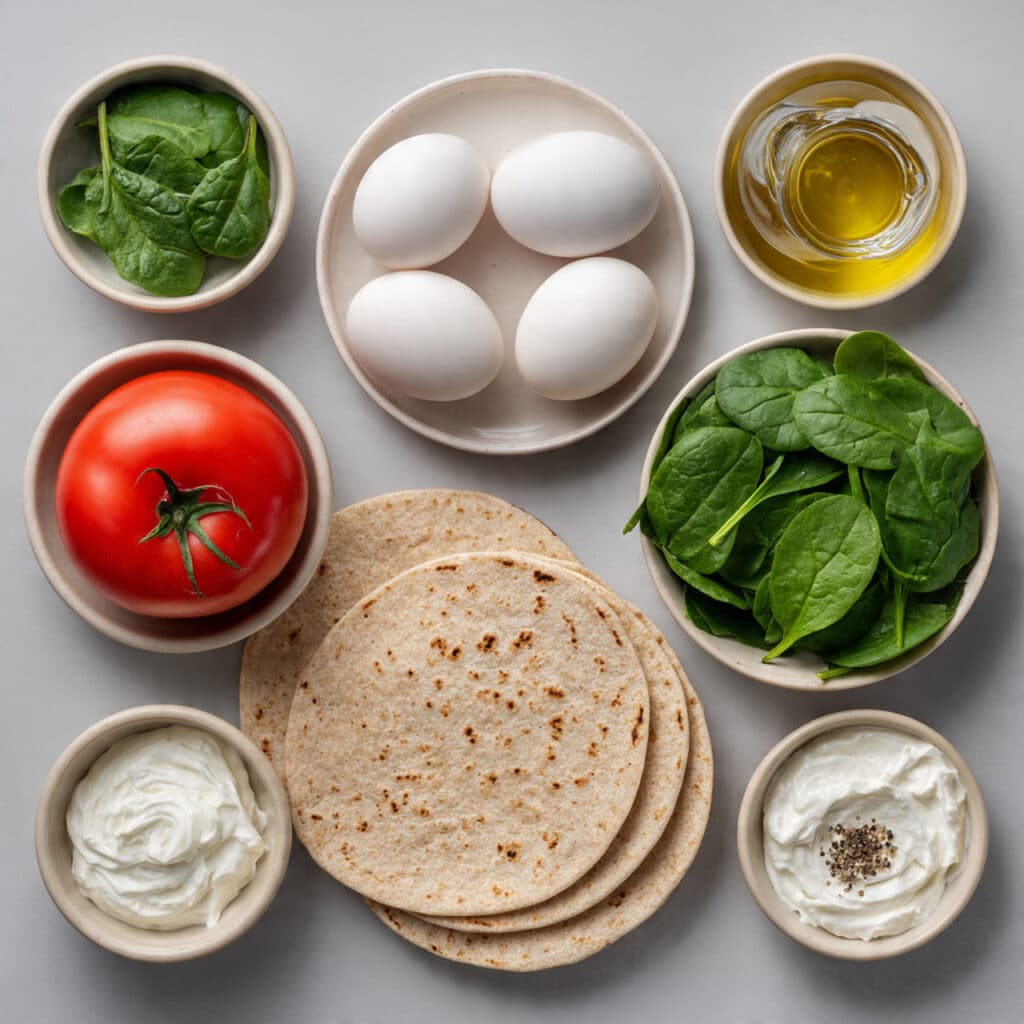 The first bite is soft and creamy from the eggs and yogurt. Then you get a fresh burst from the spinach and tomato. The tortilla holds everything together with a gentle chew. The flavors develop simply but clearly, savory eggs, tangy yogurt, sweet tomato, and a touch of pepper. It is light yet deeply satisfying.