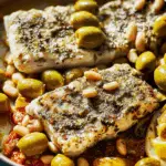 Tender baked white fish tucked into a citrusy bed of lemon with a bright herb and green olive topping, delivering a fresh Mediterranean aroma and a briny, juicy bite in every forkful.