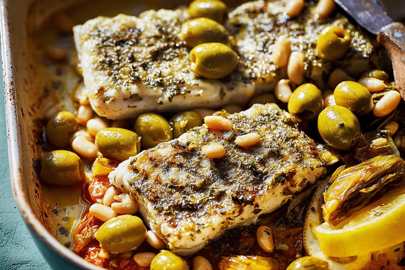 - Assemble the Dish: Arrange fish fillets on top, then spoon the olive and herb mixture over them evenly.