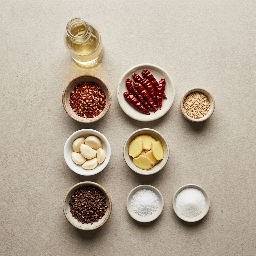 A bold and aromatic homemade spicy chili oil infused with dried chilies, garlic, ginger, and warm spices. Perfect for drizzling over noodles, rice, eggs, and more for an instant flavor boost.