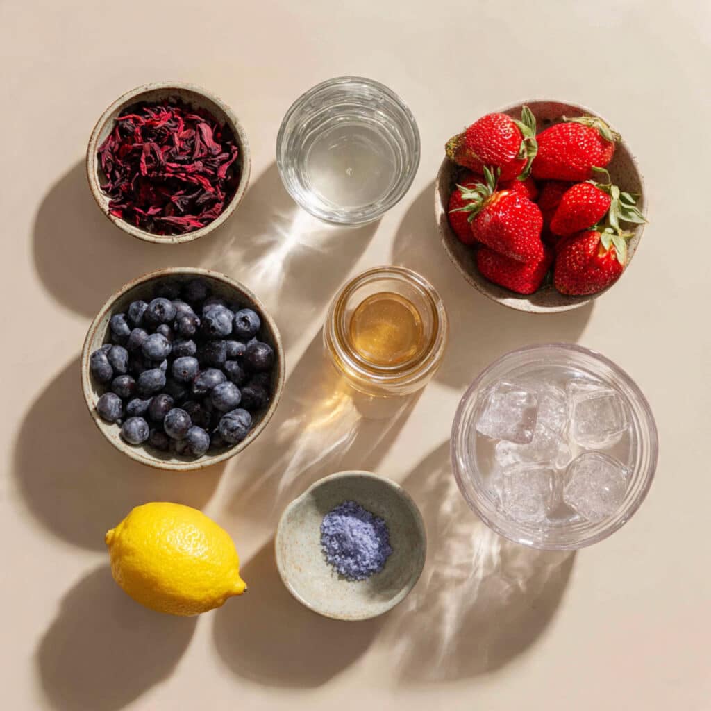 A vibrant iced hibiscus berry drink made with dried hibiscus flowers, fresh strawberries, blueberries, and a touch of lemon. Bold, refreshing, and naturally caffeine free.