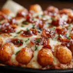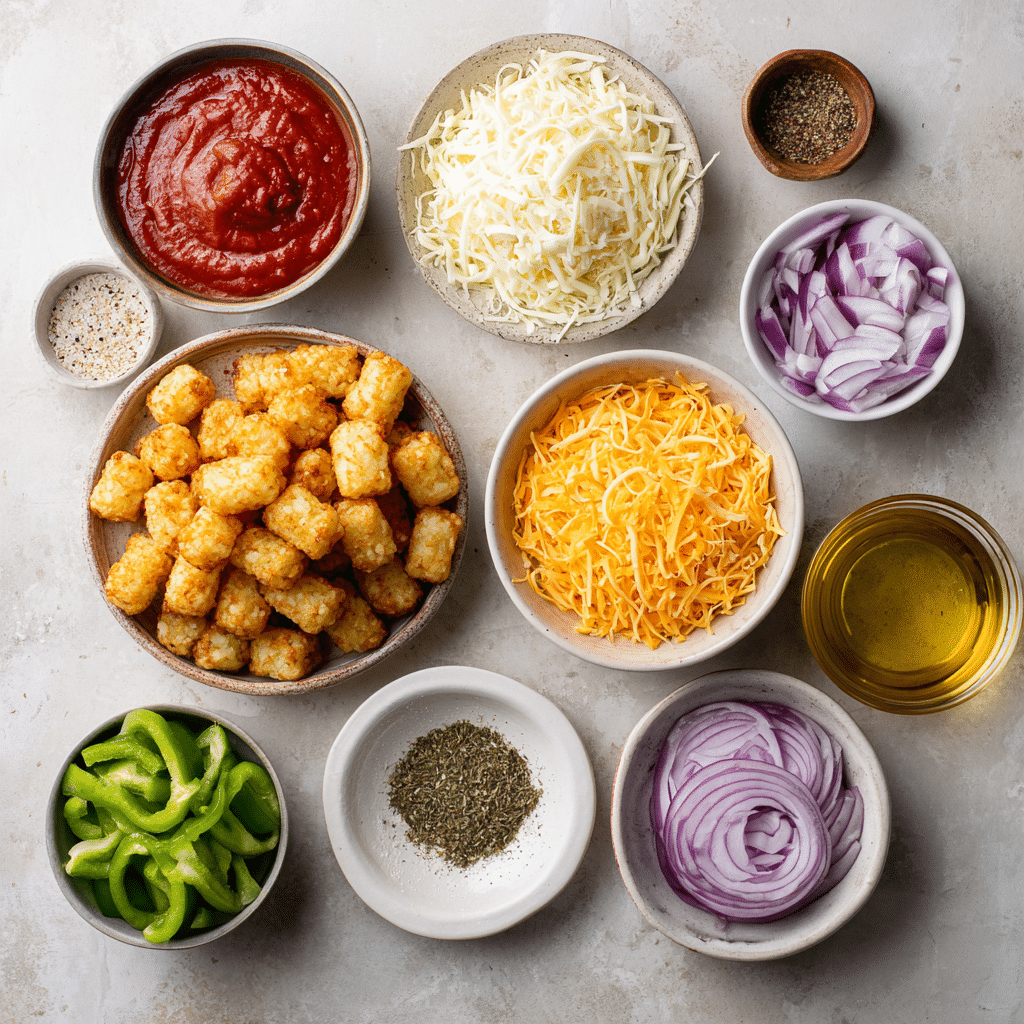 This recipe was born from a craving for comfort with a side of fun. One rainy weekend afternoon, rummaging through the freezer, I stumbled upon a forgotten bag of tater tots and a half-used jar of pizza sauce. With a bit of creativity and a whole lot of hunger, the idea to swap pizza dough with tater tots was born. What came out of the oven was a bubbling, cheesy masterpiece that quickly became a family favorite. It’s nostalgic, indulgent, and just the right amount of quirky — exactly the kind of kitchen adventure that ends with happy bellies and recipe requests.