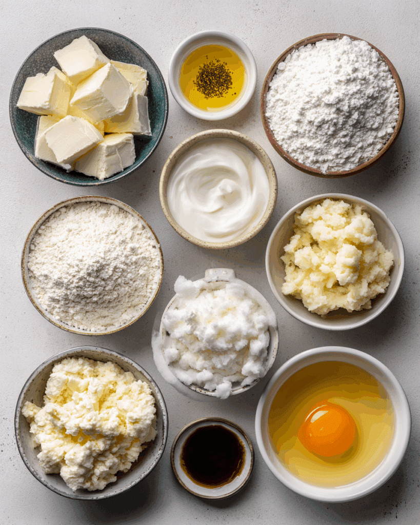 - Prepare the dough: In a mixing bowl, combine flour, softened butter, sour cream, yeast, warm water, salt, and sugar. Mix until it forms a dough. Knead for about 5–7 minutes until smooth. Cover and let it rest in a warm place for 30 minutes.