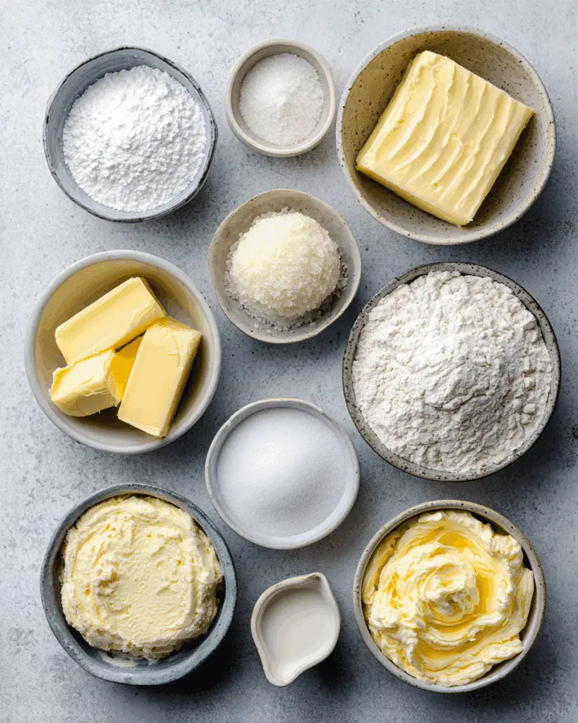 - Unsalted butter: 250 g (1 cup + 2 tbsp), at room temperature, for richness and softness