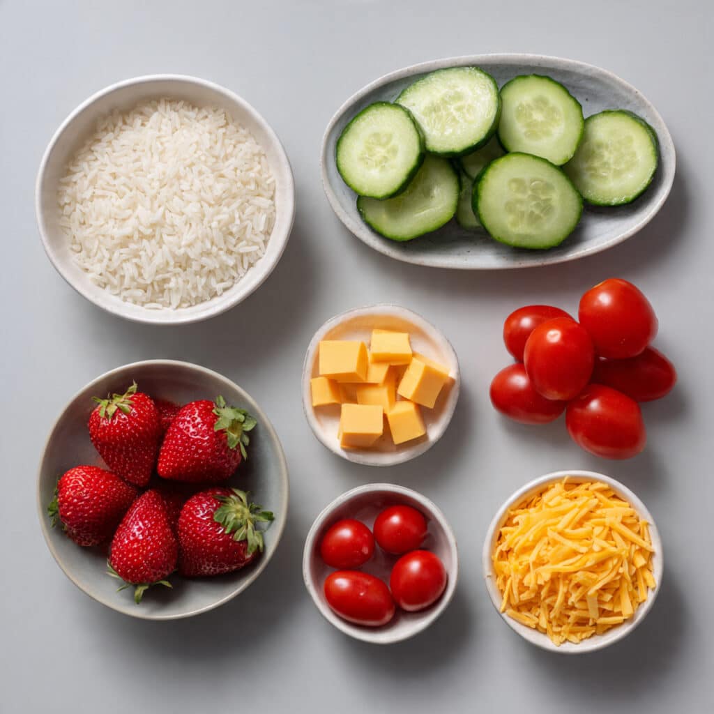 - Assemble the Dish: Shape the rice into small bite sized balls and place them in one section. Arrange cucumber slices, cherry tomatoes, cheese cubes, and strawberries neatly in separate compartments.