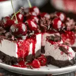 A rich and creamy No Bake Black Forest Cheesecake featuring layers of silky chocolate cheesecake, a buttery cookie crust, and a juicy cherry topping. This indulgent dessert is easy to make and perfect for any occasion.