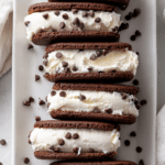 Soft chocolate cookies filled with creamy no churn vanilla ice cream and rolled in mini chocolate chips. These easy homemade ice cream sandwiches are rich, smooth, and perfect for summer treats or make ahead desserts.