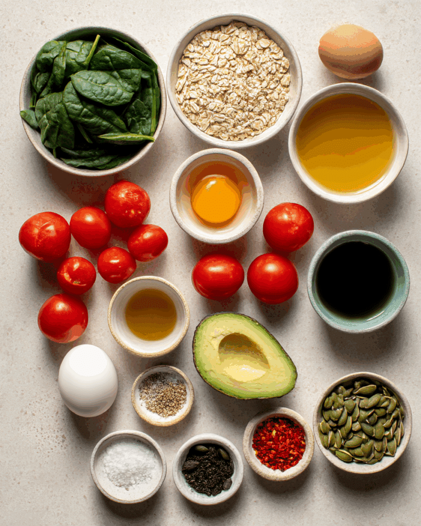 A savory twist on a classic breakfast bowl featuring creamy oats, sautéed spinach, roasted cherry tomatoes, soft-boiled egg, and avocado — packed with protein, fiber, and flavor.