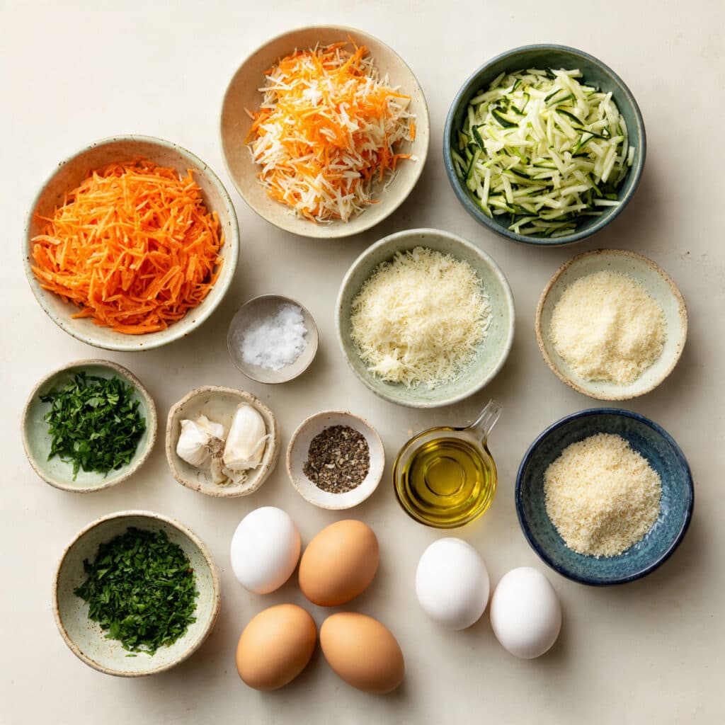 - In a large bowl, combine shredded carrots, zucchini (squeezed dry), onion, garlic, breadcrumbs, Parmesan, eggs, parsley, salt, and pepper.