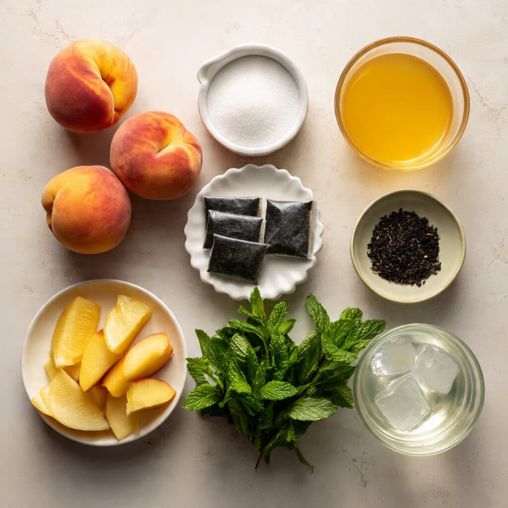 - Sugar: 1/2 cup. Used to make the peach syrup, it balances the tea’s natural bitterness.