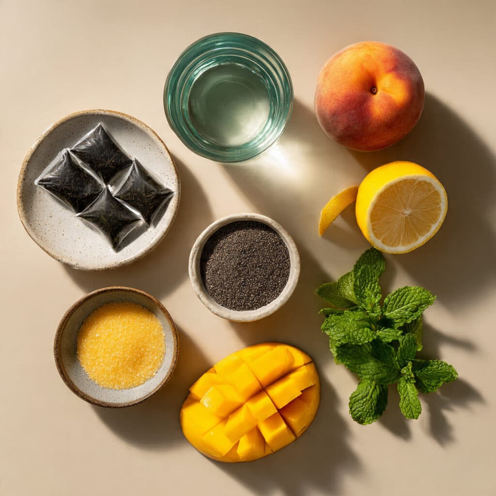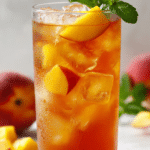 A bright and refreshing homemade iced tea infused with fresh peach and mango, lightly sweetened and perfectly chilled for warm days.