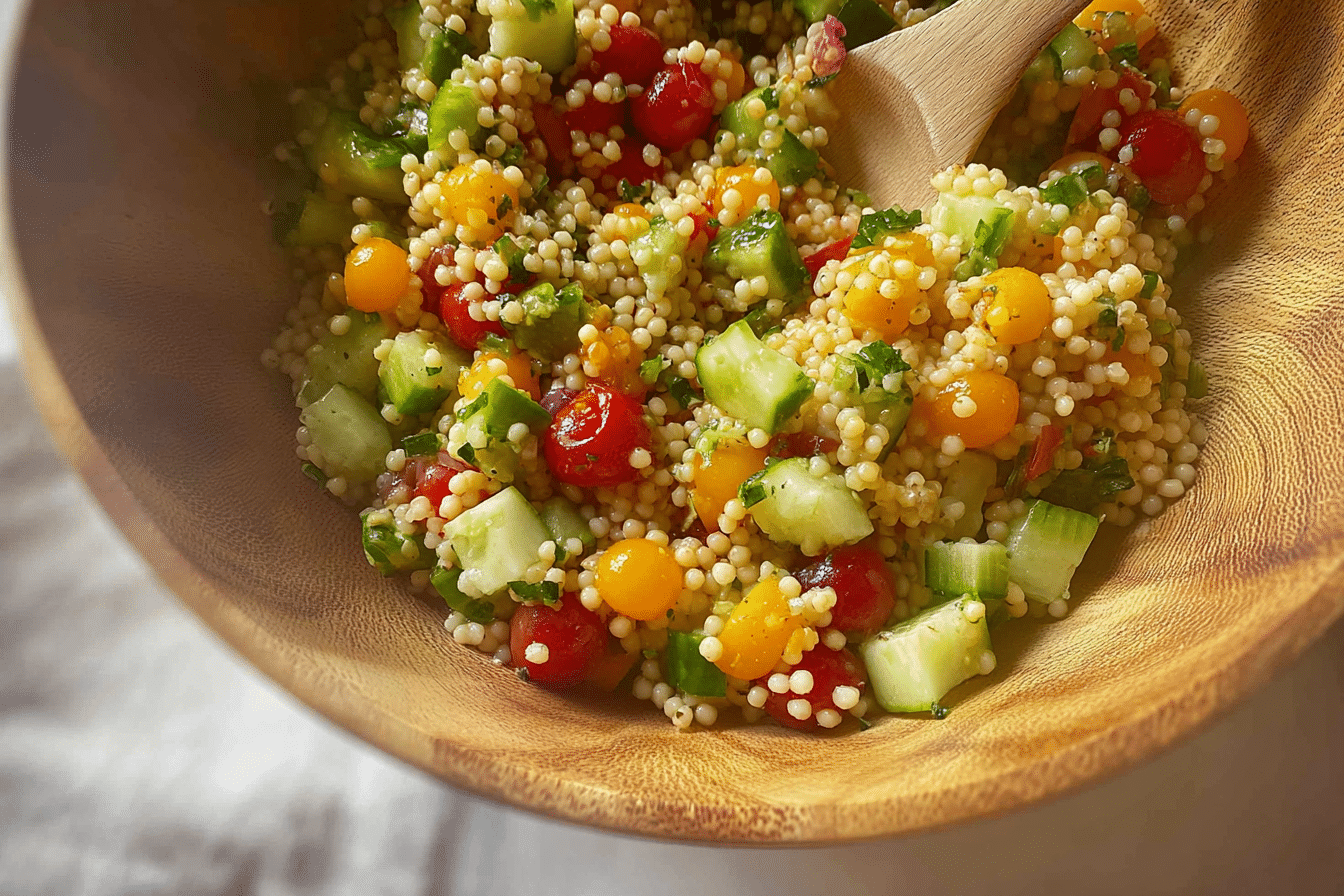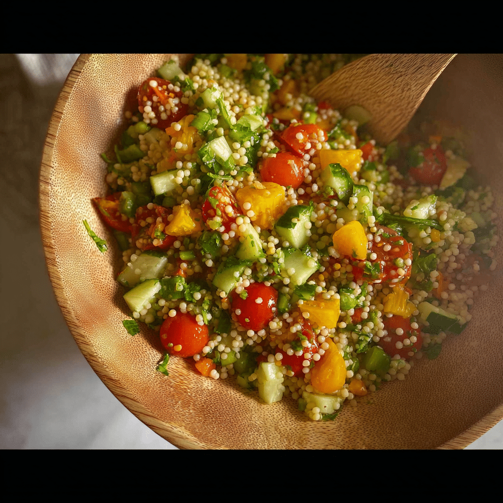 The inspiration for this salad came during a trip to a coastal café, where I was served a colorful couscous dish dotted with roasted vegetables and fragrant herbs. The pearls of couscous had such a playful texture — plump, chewy, and slightly nutty. Back in my kitchen, I recreated it with a few tweaks: a zesty citrus dressing, bursts of feta, and fresh herbs. Now, it’s my go-to when I want something vibrant, satisfying, and a little out of the ordinary.