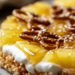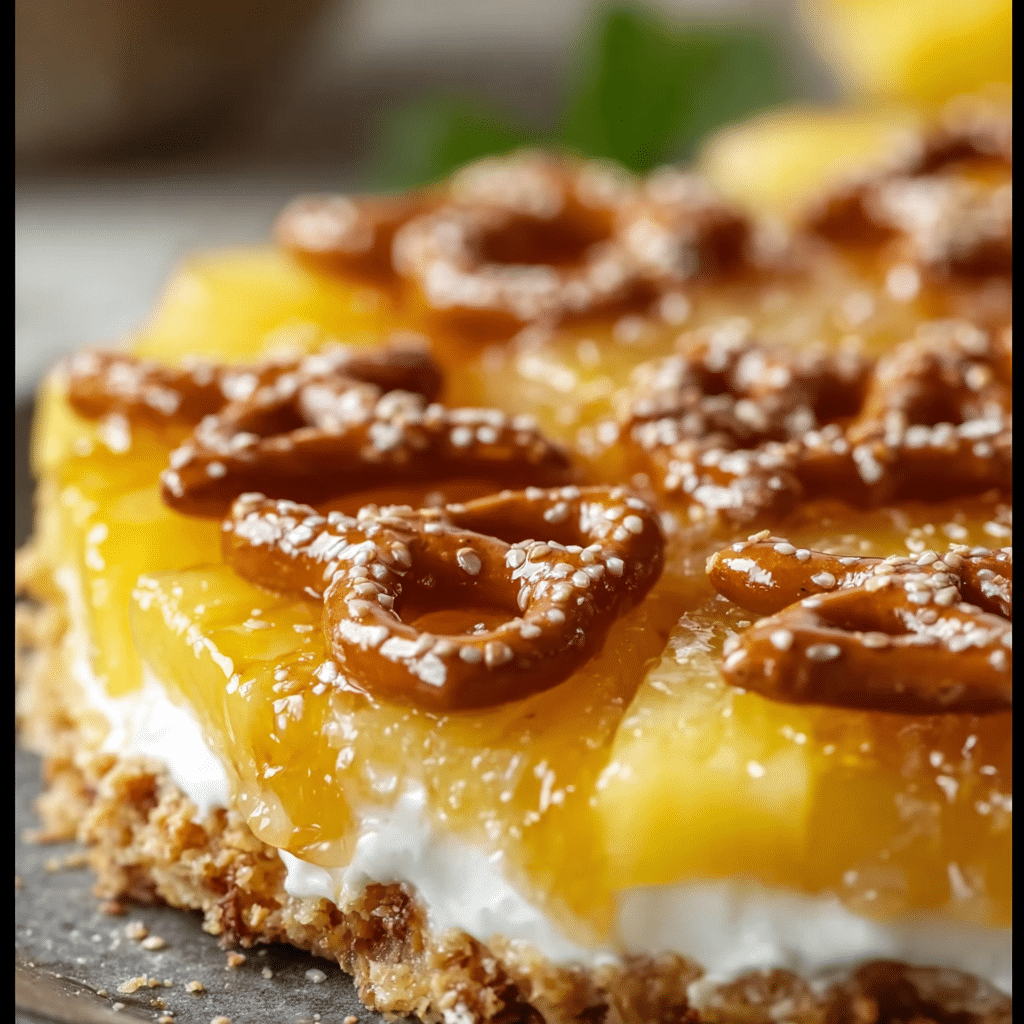 A sweet and salty treat combining a crunchy pretzel crust, a creamy filling, and juicy pineapple. Perfect for any gathering!